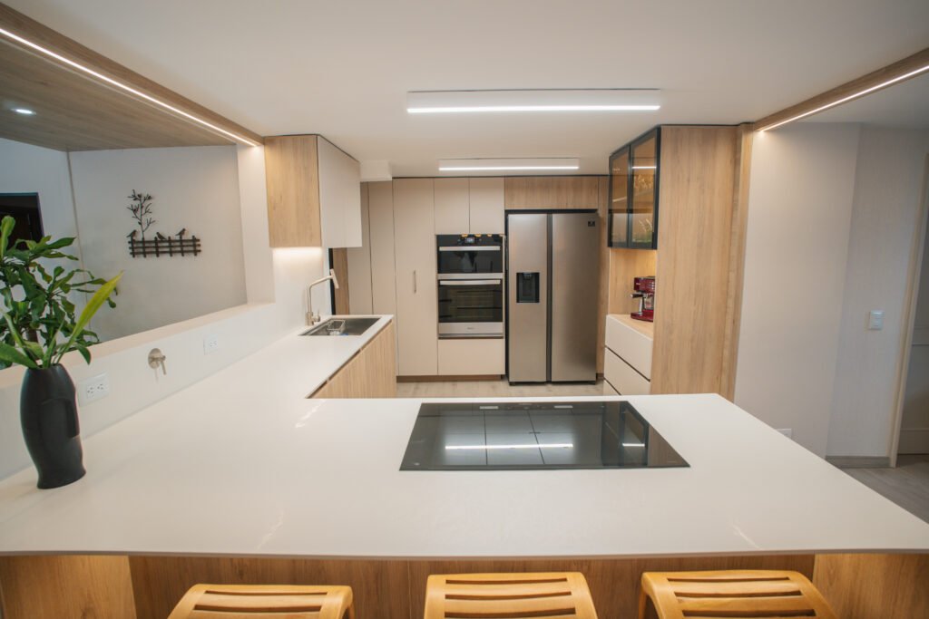 Nos especializamos en cocinas y baños premium, y remodelaciones integrales de apartamentos y casas de alto nivel. Cada proyecto comienza con una fase de diseño profesional, donde definimos distribución, materiales, acabados, iluminación y especificaciones técnicas antes de iniciar la ejecución. Esta etapa nos permite establecer un presupuesto claro, evitar improvisaciones y tomar decisiones estratégicas desde el principio.